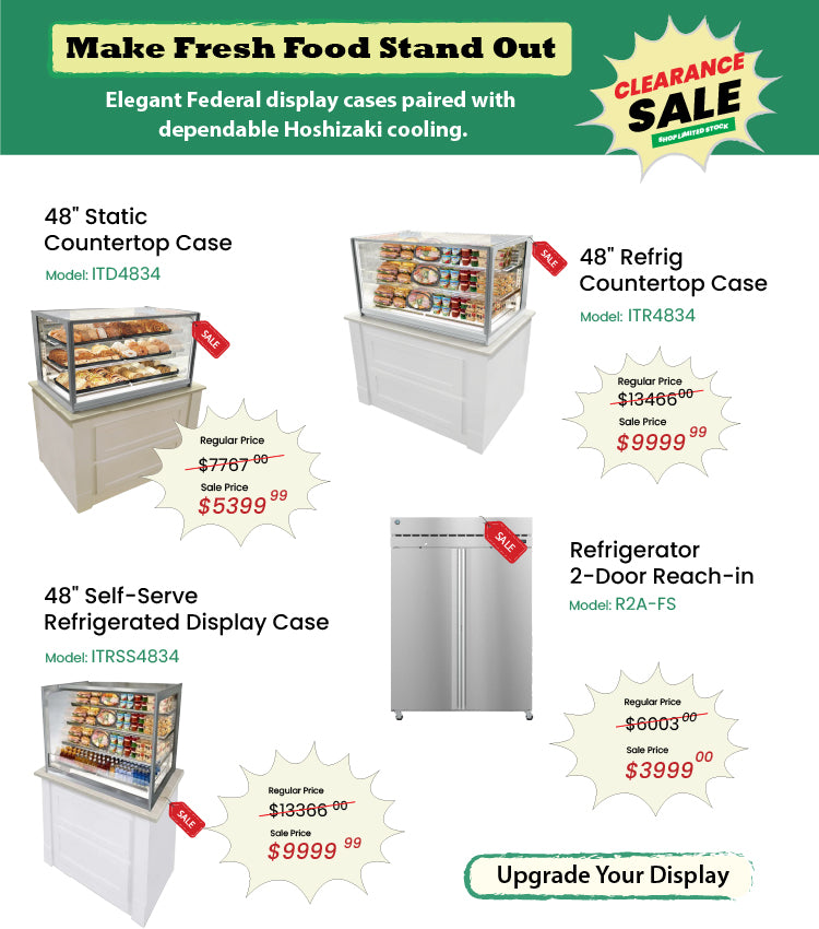 This month’s clearance includes reach-in refrigerators and freezers, prep tables, ranges, griddles, fryers, charbroilers, bakery and merchandiser display cases, and specialty equipment from trusted brands like True, Continental, Hoshizaki, Alto-Shaam, Federal, Valyr, Taylor, Grindmaster, Structural Concepts, and more.