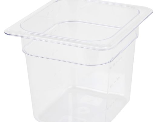 An excellent alternative to stainless steel food pans, this 1/6 size 6" deep food pan is made from shatter- and scratch-resistant polycarbonate. Lightweight yet strong, the food storage pan will make your food handling tasks much more efficient. These pans are able to withstand a wide range of temperatures from -40ºF to 210ºF, and with a matching lid they’ll keep the contents safe and uncontaminated during storage or transport. Ideal for use on refrigerated salad, sandwich and pizza prep tables, as well as salad bars, buffets and cold food stations, the pans can be used with solid or slotted lids and drain trays. Caterers and cooks in commercial kitchens will especially appreciate the benefits of this ingredient food storage pan—the ability to immediately identify the contents, as well as their stackability and durability. This NSF-listed temperature-resistant polycarbonate pan is suitable for use with cold foods or low-heat applications. It’s dishwasher safe, and prevents the build-up of oils and acids, so is stain-resistant.