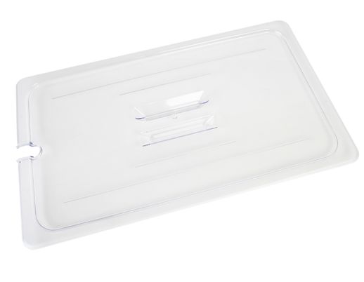 Designed to fit snugly on your existing and compatible plastic food pans, these full size slotted food pan lids are the perfect solution for salad bars, self-service buffet stations, salad prep tables, and more. Caterers and cooks in commercial kitchens will especially appreciate the benefits of a clear food pan lid with a notch for a spoon or ladle. An excellent alternative to stainless steel food pans, polycarbonate pans and plastic food pan covers will make your food handling tasks much more efficient. They’re able to withstand a wide range of temperatures from -40ºF to 210ºF, and the clear polycarbonate food pan lid with notch makes it easy to see the contents. The scratch-resistant and shatter-resistant food pan cover has a built-in handle that makes it easier to take the lid off. Keep the contents in your food storage containers safe and uncontaminated during storage or transport with this full size slotted food pan lid.