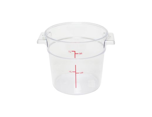 Keep the contents of your food containers fresh and safe from contaminants with this 1-Qt. clear round food storage container. Store soup, leftovers, sliced vegetables, cut fruit, sauces, or whatever you want to keep food safe. The polycarbonate food storage container is shatter and scratch resistant, durable, and can withstand temperatures from -40ºF to 210ºF. The clear container makes it easy to identify contents at a glance. With a matching lid, the container seals in moisture and freshness better than foil or plastic wrap, and keeps dirt, debris and contaminants at bay. Dishwasher safe, the container resists food acids and oils, so is easy to keep clean. Molded and colored gradations provide measurements in liters and quarts, and the container is stackable for storage. The food container measures 5” in diameter by 5” tall, and is NSF listed.