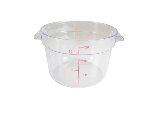 Keep the contents of your food containers fresh and safe from contaminants with this 12-Qt. clear round food storage container. Store soup, leftovers, sliced vegetables, cut fruit, sauces, or whatever you want to keep food safe. The polycarbonate food storage container is shatter and scratch resistant, durable, and can withstand temperatures from -40ºF to 210ºF. The clear container makes it easy to identify contents at a glance. With a matching lid, the container seals in moisture and freshness better than foil or plastic wrap, and keeps dirt, debris and contaminants at bay. Dishwasher safe, the container resists food acids and oils, so is easy to keep clean. Molded and colored gradations provide measurements in liters and quarts, and the container is stackable for storage. The food container measures 12-2/5" in diameter x 8-3/7" tall, and is NSF listed.