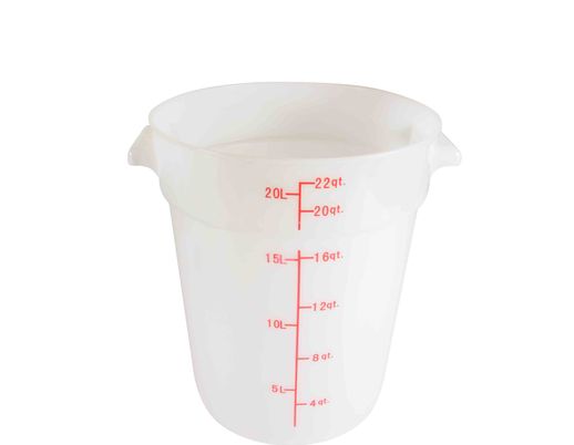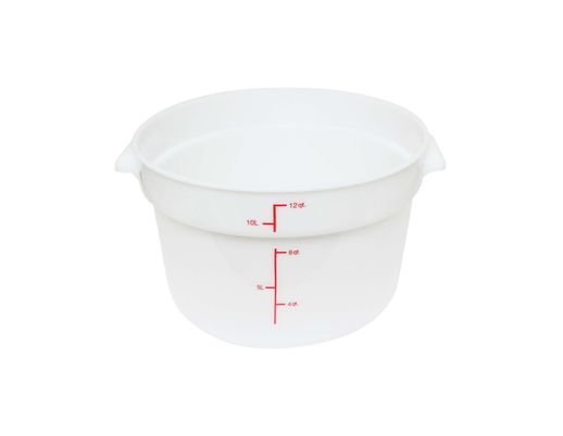 Keep the contents of your food containers fresh and safe from contaminants with this 12-Qt. white food storage container. Store soup, leftovers, sliced vegetables, cut fruit, sauces, or whatever you want to keep food safe. The polypropylene round food storage container is flexible, durable and can withstand temperatures from -40ºF to 160°F. With a matching lid, the BPA-free container seals in moisture and freshness better than foil or plastic wrap, and keeps dirt, debris and contaminants at bay. Dishwasher safe, the food storage container is stain and chemical resistant, and is easy to keep clean. Molded and colored gradations provide measurements in liters and quarts, and the container is stackable for storage. The food container measures 12-2/5" in diameter x 8-3/7" tall, and is NSF listed.