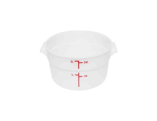 Keep the contents of your food containers fresh and safe from contaminants with this 2-Qt. white round food storage container. Store soup, leftovers, sliced vegetables, cut fruit, sauces, or whatever you want to keep food safe. The polypropylene round food storage container is flexible, durable and can withstand temperatures from -40ºF to 160°F. With a matching lid, the BPA-free container seals in moisture and freshness better than foil or plastic wrap, and keeps dirt, debris and contaminants at bay. Dishwasher safe, the food storage container is stain and chemical resistant, and is easy to keep clean. Molded and colored gradations provide measurements in liters and quarts, and the container is stackable for storage. The food container measures 7-2/5" in diameter x 4-1/4" tall, and is NSF listed.
