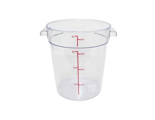 Keep the contents of your food containers fresh and safe from contaminants with this 4-Qt. clear round food storage container. Store soup, leftovers, sliced vegetables, cut fruit, sauces, or whatever you want to keep food safe. The polycarbonate food storage container is shatter and scratch resistant, durable, and can withstand temperatures from -40ºF to 210ºF. The clear container makes it easy to identify contents at a glance. With a matching lid, the container seals in moisture and freshness better than foil or plastic wrap, and keeps dirt, debris and contaminants at bay. Dishwasher safe, the container resists food acids and oils, so is easy to keep clean. Molded and colored gradations provide measurements in liters and quarts, and the container is stackable for storage. The food container measures 7-2/5" in diameter x 8-1/2" tall, and is NSF listed.