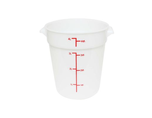 Keep the contents of your food containers fresh and safe from contaminants with this 4-Qt. white food storage container. Store soup, leftovers, sliced vegetables, cut fruit, sauces, or whatever you want to keep food safe. The polypropylene round food storage container is flexible, durable and can withstand temperatures from -40ºF to 160°F. With a matching lid, the BPA-free container seals in moisture and freshness better than foil or plastic wrap, and keeps dirt, debris and contaminants at bay. Dishwasher safe, the food storage container is stain and chemical resistant, and is easy to keep clean. Molded and colored gradations provide measurements in liters and quarts, and the container is stackable for storage. The food container measures 7-2/5" in diameter x 8-1/2" tall, and is NSF listed.