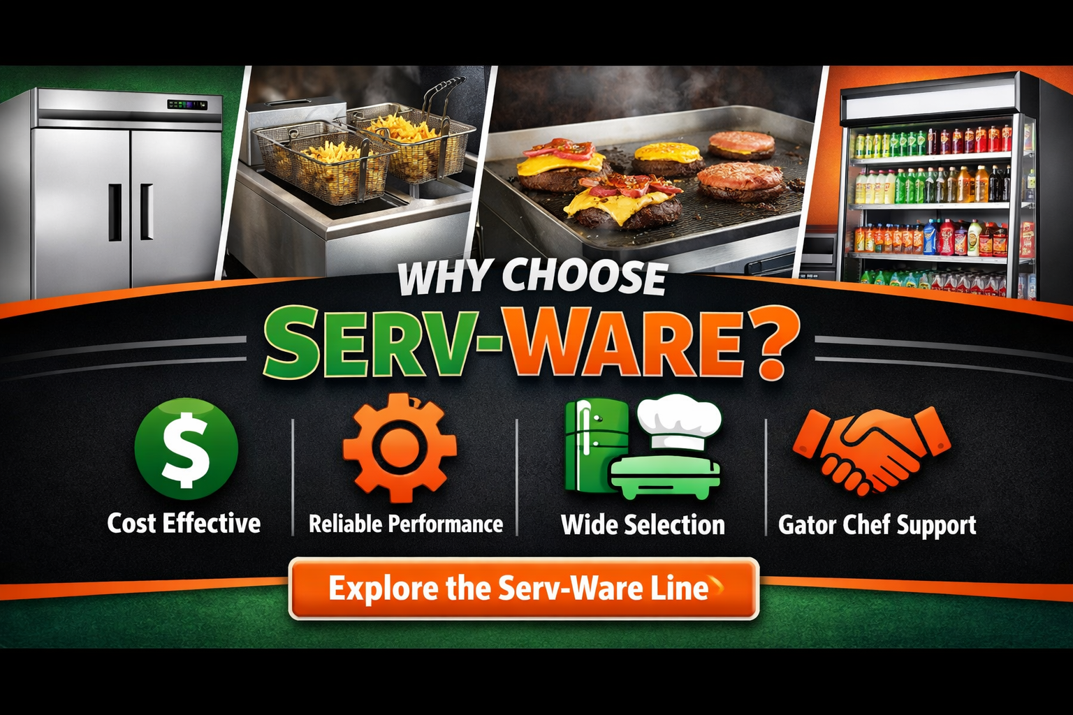 Introducing Serv-Ware, Gator Chef’s new economy line of commercial refrigeration and cooking equipment — designed to deliver reliable performance at a cost that works for growing kitchens.