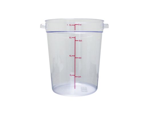 Keep the contents of your food containers fresh and safe from contaminants with this 8-Qt. clear round food storage container. Store soup, leftovers, sliced vegetables, cut fruit, sauces, or whatever you want to keep food safe. The polycarbonate food storage container is shatter and scratch resistant, durable, and can withstand temperatures from -40ºF to 210ºF. The clear container makes it easy to identify contents at a glance. With a matching lid, the container seals in moisture and freshness better than foil or plastic wrap, and keeps dirt, debris and contaminants at bay. Dishwasher safe, the container resists food acids and oils, so is easy to keep clean. Molded and colored gradations provide measurements in liters and quarts, and the container is stackable for storage. The food container measures 8-8/9" in diameter x 10-4/5" tall, and is NSF listed.