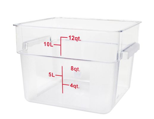 Keep the contents of your food containers fresh and safe from contaminants with this square 12-Qt. clear food storage container. Store soup, leftovers, sliced vegetables, cut fruit, sauces, or whatever food you want to keep safe. The polycarbonate food storage container is shatter and scratch resistant, durable, and can withstand temperatures from -40ºF to 210ºF. The clear container makes it easy to identify contents at a glance. Wide, molded handles make it easy to lift and transport, and the textured bottom acts as a non-skid surface and protects against scratches. With a matching lid (sold separately), the container seals in moisture and freshness better than foil or plastic wrap, and keeps dirt, debris and contaminants at bay. Dishwasher safe, the container resists food acids and oils, so is easy to keep clean. Molded red-colored gradations provide measurements in liters and quarts, and the container is stackable for storage. The food container measures approximately 10-7/8" x 10-7/8" x 8”, and is NSF listed.